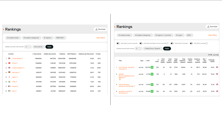 - Journal Rankings: This is the most used feature. Users can quickly look up journals, compare scores, and understand trends in their field. Rankings include detailed metrics such as SJR scores, citations per document, H-index, and even the percentage of female authorship.
